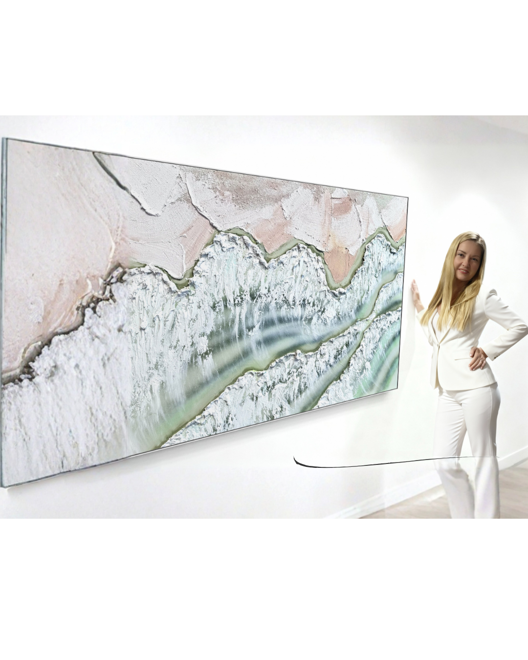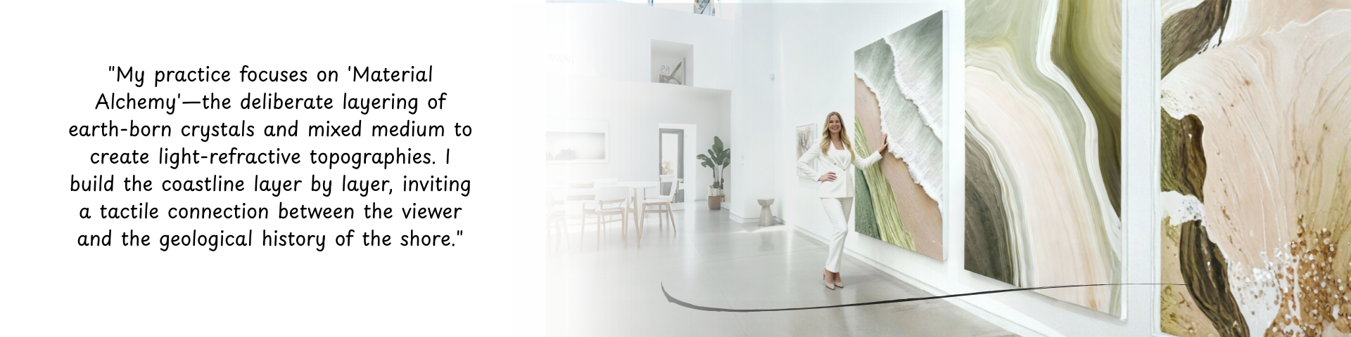Her signature practice, Sculptural Topographies (2025-2026), is built on "Material Alchemy"—transforming coastal materials into sophisticated art through meticulous layering of premium mixed media acrylics, Sand collected from around the world, and genuine minerals including Amethyst and Quartz. Using her signature whipped texture technique and architectural impasto, she creates three-dimensional surfaces that shift with changing light, evoking windswept dunes and tidal patterns.