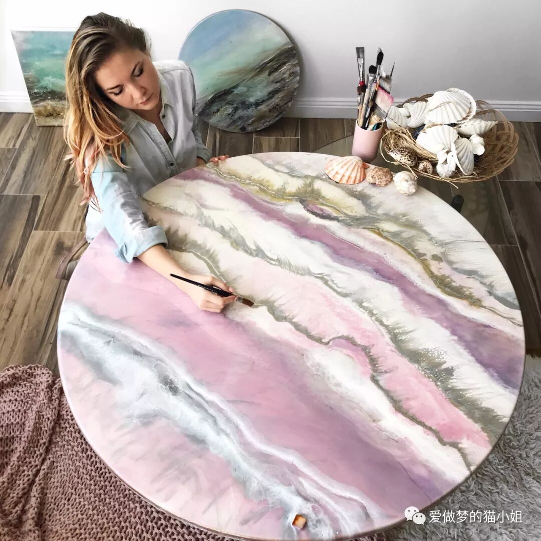 在她的画作中,你能看到她把这些贝壳、细沙、岩石和水晶都融入其中