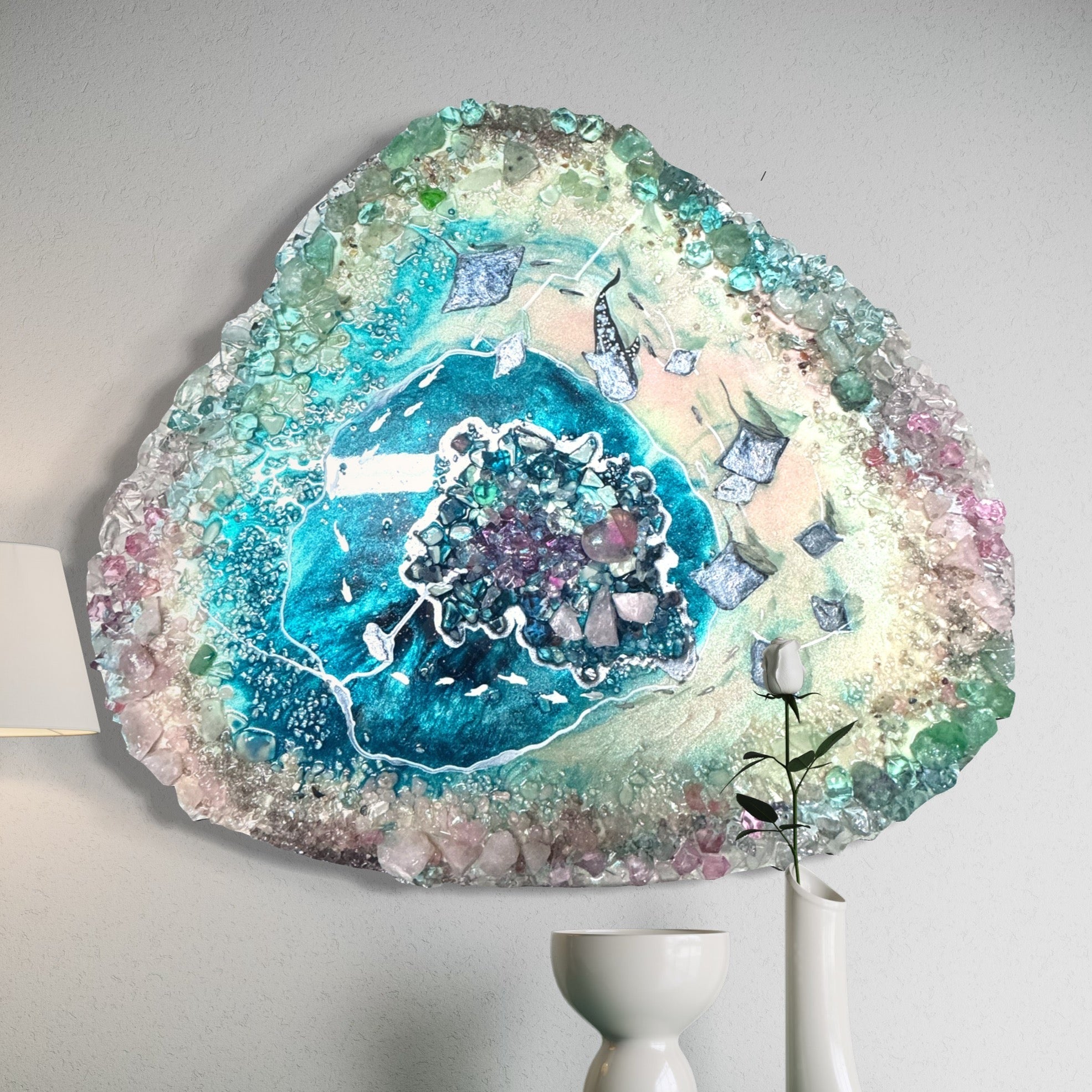 Heart Reef Bliss Set of 2 with Swarovski, Amethyst, Agate, Quartz & Epoxy Glass on Canvas 40x50cm.