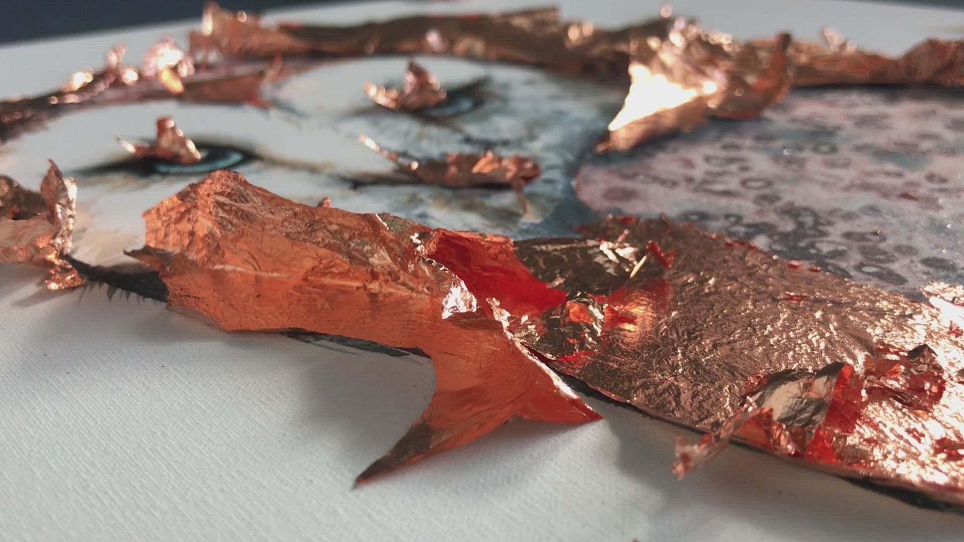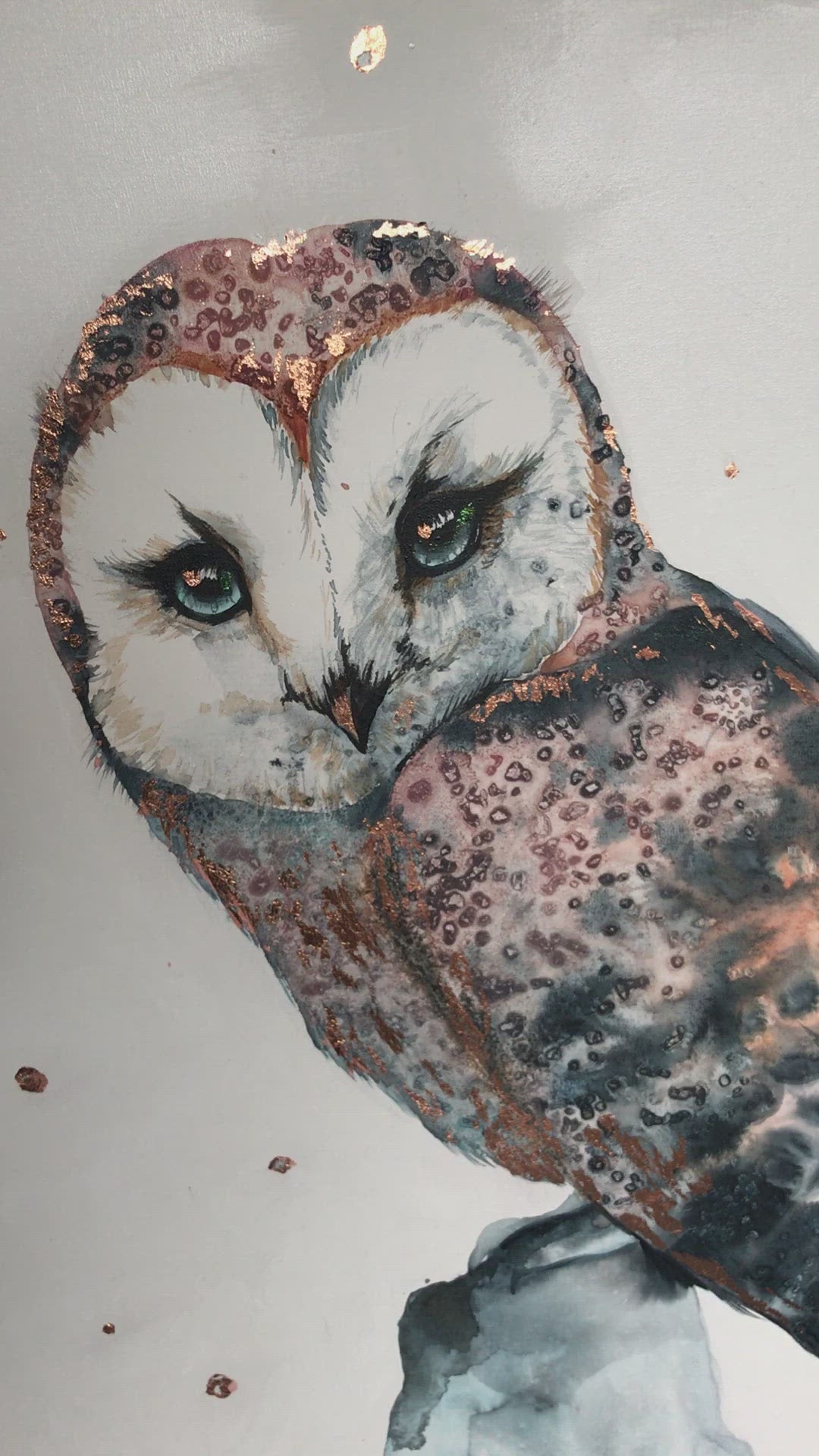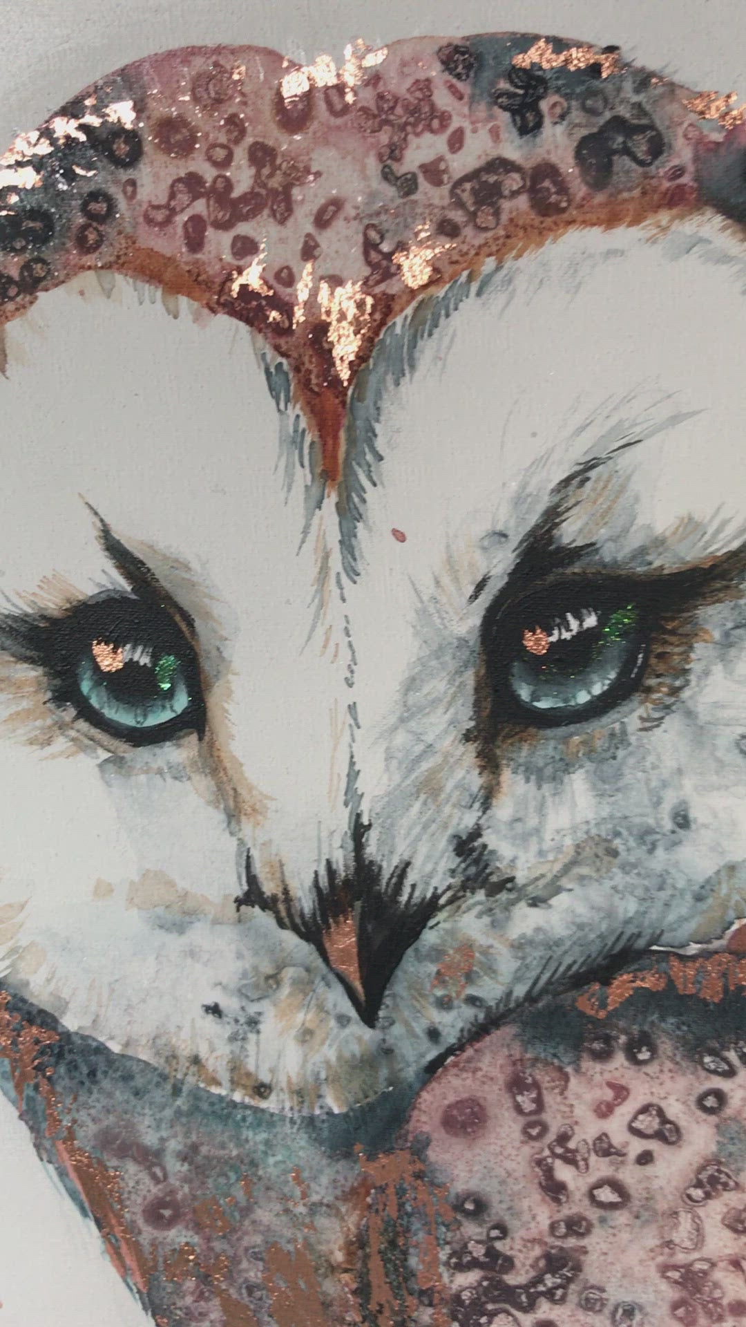 Australian masked Owl inspired painting with Rose gold leaf And colorful flakes on rectangular canvas. Ombré brown neutral beige with grey and black owl on white background with blue green eyes or any other colors of your choice.
