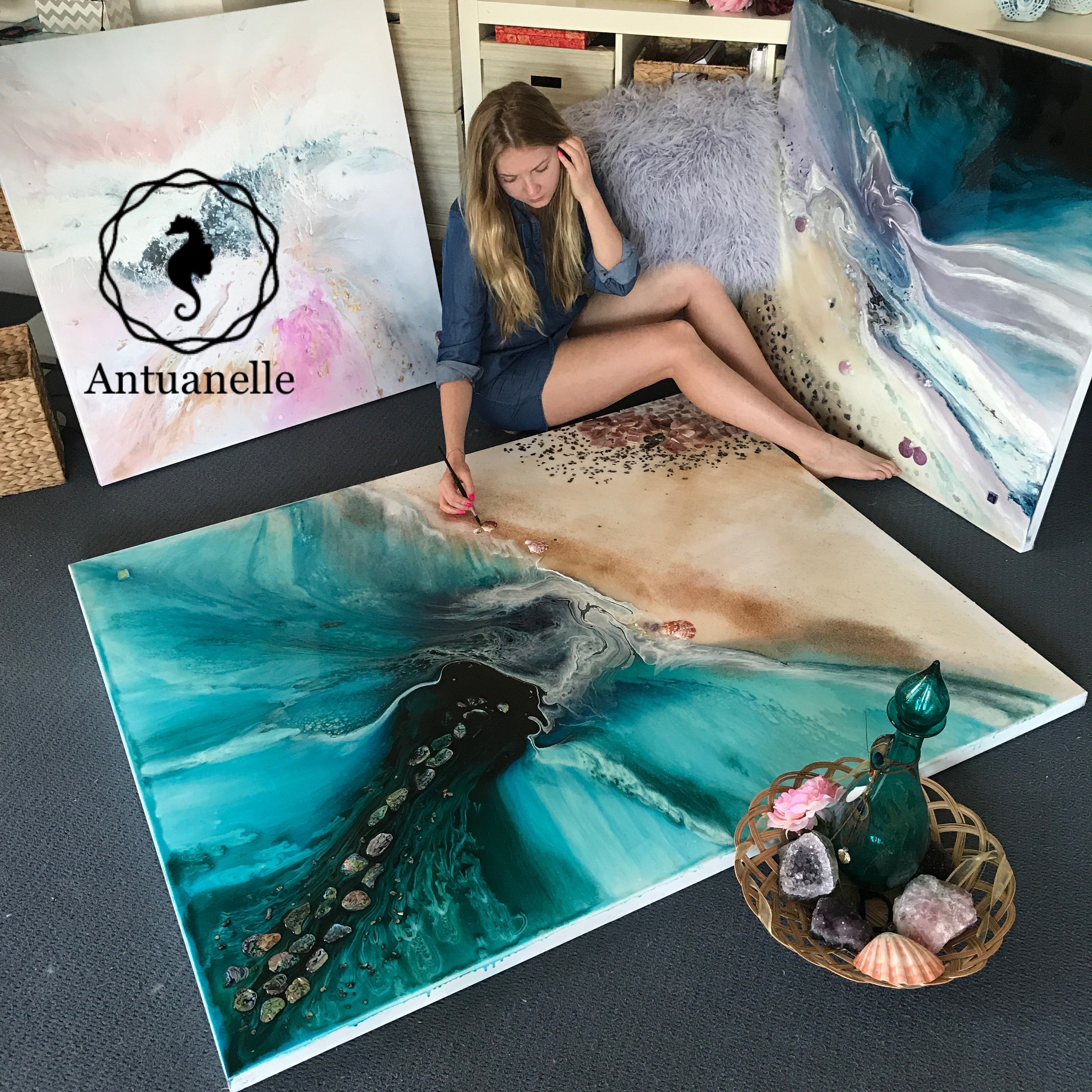 ORDERING COMMISSION: very simple - just choose your size and place an order - then email/notes your suggestions (color/size/shapes/add-on crystals/seashells or preferred ANTUANELLE'S artwork that you want your commission to look like)