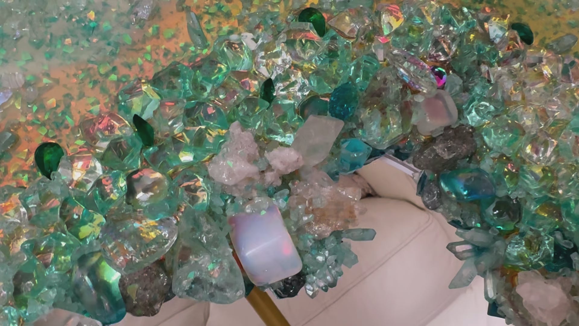 This sophisticated and captivating Aqua Aura crystal reef artwork showcases genuine Moonstones and Aqua Aura crystals in shimmering aqua blue and silver hues. Featuring holographic shimmer and pigments that shift from peachy pink to bright apple green as you move around it, this piece commands attention and complements other crystal accents in your space. Mounted on a wood panel with textured mixed media elements, including glass, and crystals, it offers elegant three-dimensional details. The vibrant energy of Aqua Aura Quartz activates all chakras, enhancing communication and psychic abilities, while Moonstone symbolizes clarity, feminine energy, and new beginnings. Ready to hang with framing options available.