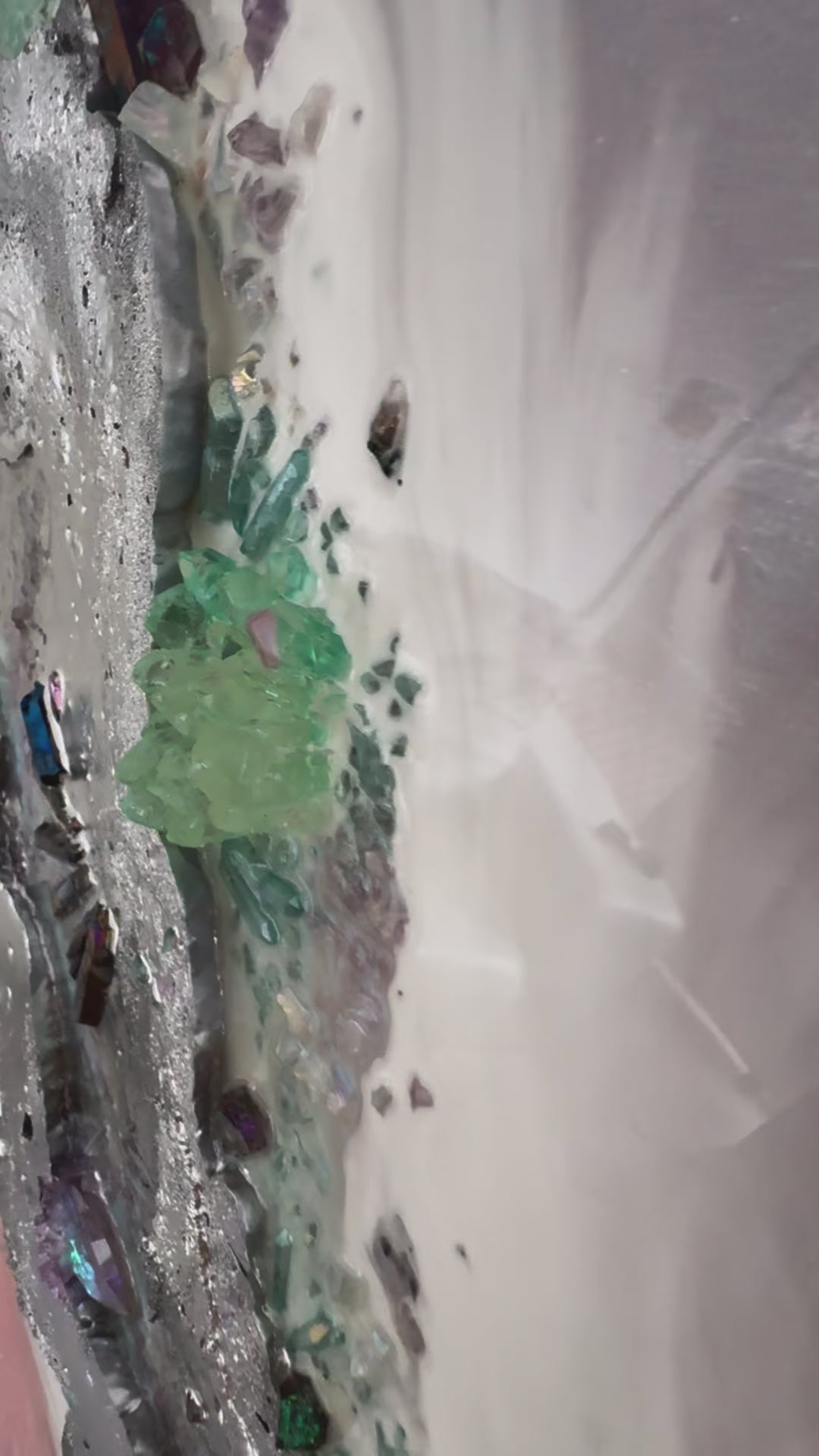Sophisticated and striking Purple Pink and Orange Crystal Artwork with silver accents. Made with Aqua Aura Quartz crystals,Amethyst, Titanium Aura Quartz, and Swarovski artwork with crystals, holographic shimmer, and color-changing pigments will be a centerpiece of attention and a good addition to other crystal accents in your interior.